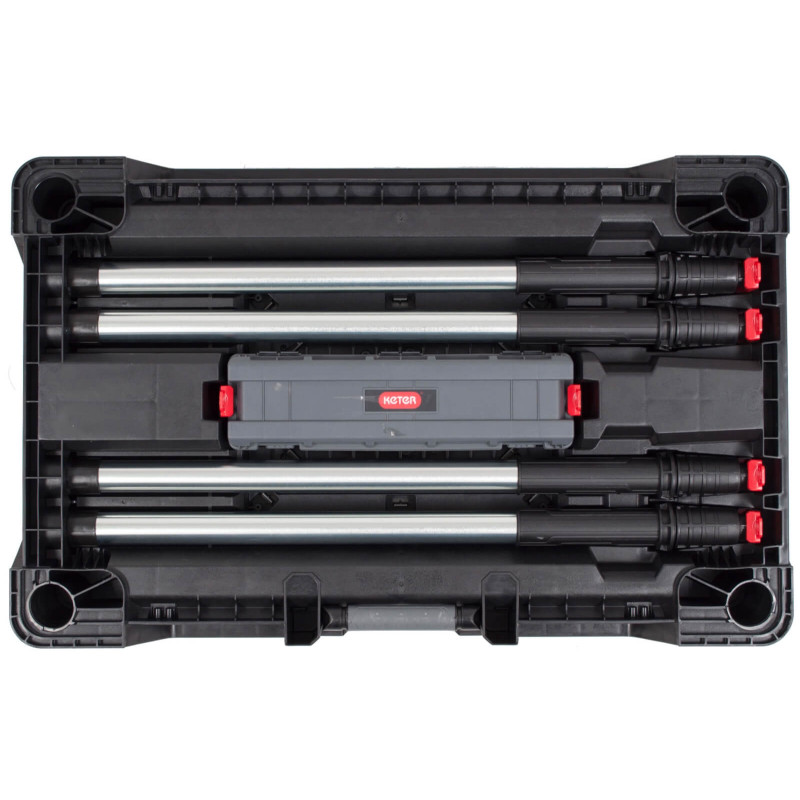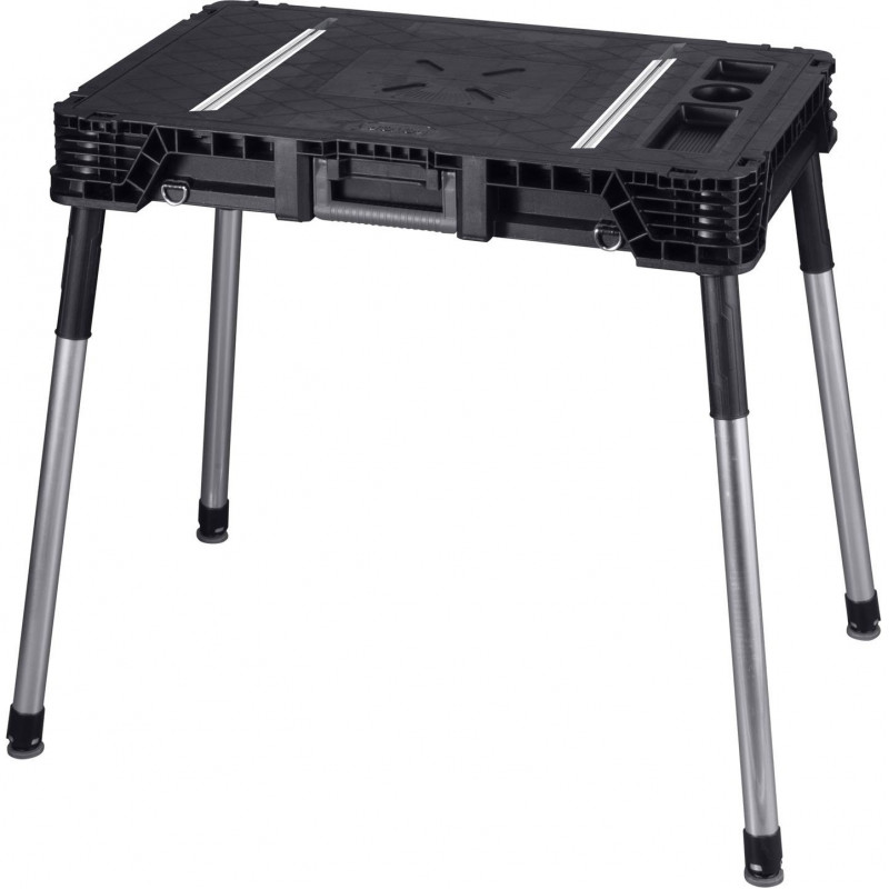 Ātri izjaucams un saliekams darba galds, īpaši ērts transportēšanai, kompakts, izturīgs, piemērots dažādu darbu veikšanai, komplektā ir skrūvspīles, kurās var viegli nostiprināt dažādus profilus slīpējot, zāģējot, urbjot u. tml.