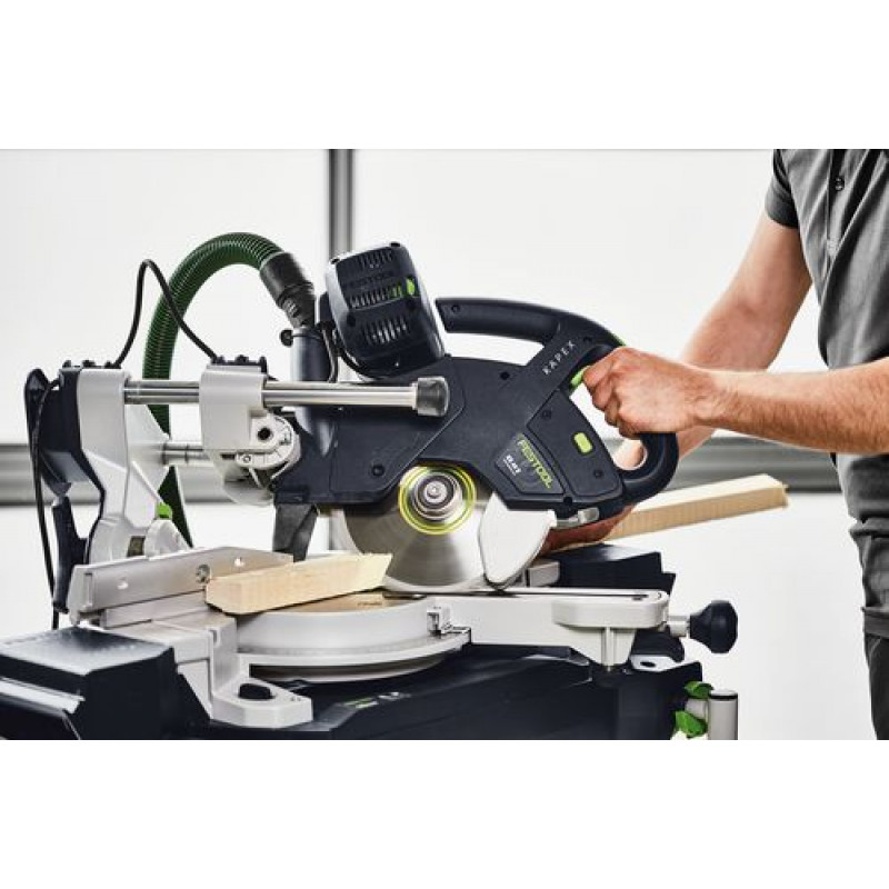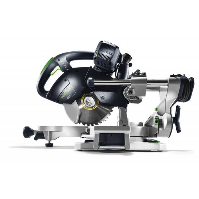 Festool KAPEX KS 60 ar iespaidīgām funkcijām, piemēram, ergonomiski novietotiem rokturiem, elektrovada turētāju un transportēšanas stāvokļa fiksātors, kā arī ar ārkārtīgi kompaktu dizainu, pateicoties iebūvējamām vadotnes sliedēm, šis Festool leņķa zāģis nedot nekādus kompromisus precizitātes un zāģēšanas daudzpusības ziņā - zāģējumi leņķos uz abām pusēm līdz 60° un zāģēšna horizontāli leņķos uz abās pusēs līdz 46° vai 47°. Festool divas vadotnes sliedes ar diviem gultņiem nodrošina, ka zāģripa tiek vadīta precīzi un vienmērīgi. Vēl citas darbam noderīgi papildaprīkojumi, piemēram, LED gaismas, izvelkams pagarinājuma galds, papildu gropes iestrādes funkcija ar zāģēšanas dziļuma ierobežotāju un sasvērtā zāģēšana, padara KAPEX KS 60 par perfektu mobilitātes, daudzpusības un optimālu zāģēšanas rezultātu kombināciju.