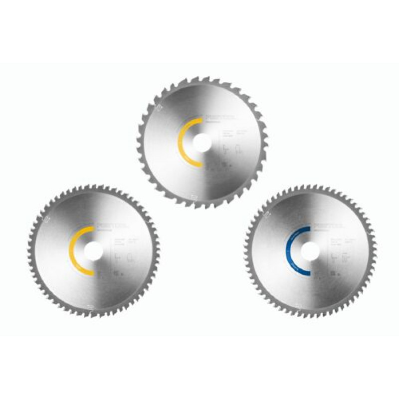 • Zāģripu komplektā ir 3 Festool zāģripas - ​WOOD FINE CUT, WOOD UNIVERSAL un ALUMINIUM/PLASTICS