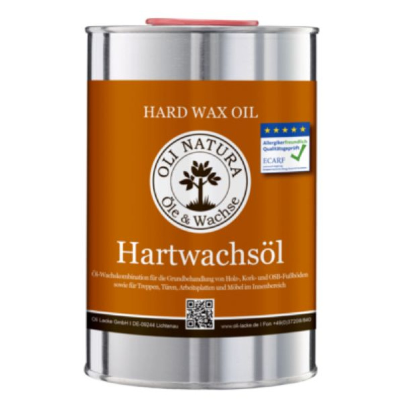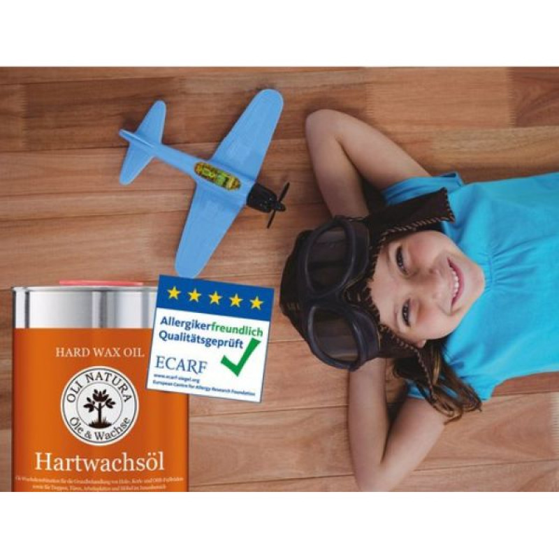 Oli-Natura Hard Wax Oil is recommended for almost all wood projects, but also for cork, bamboo, OSB and multiplex boards. It is one of our best-selling oils and is used throughout furniture and interior wood finishing as well as camper finishing. Whether for wood or frame furniture, tables, wall panelling, doors, hardwood floors or stairs. Oli-Natura Hard Wax Oil was awarded the "Allergy Friendly Quality Tested" seal by the European Centre for Allergy Research Foundation (ECARF) in 2017, and it received LFGB certification (food safe) from an independent testing laboratory.