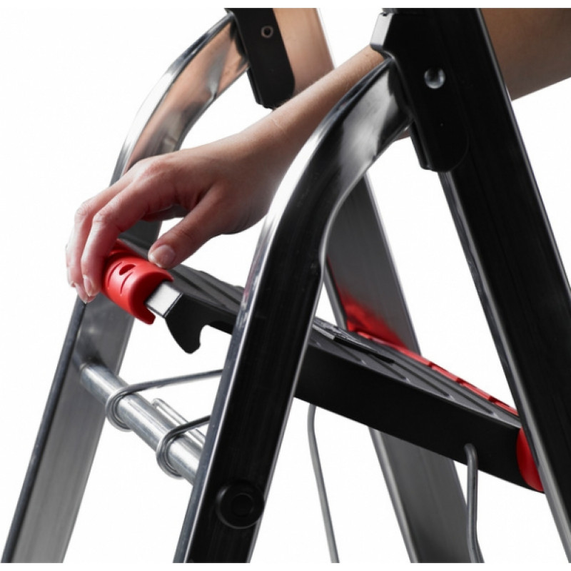 • Sadzīves kāpnes ir viegli salocīt, izmantojot HandGrip. Pateicoties vieglajam alumīnijam, Double Decker ir viegli pārvietojams.