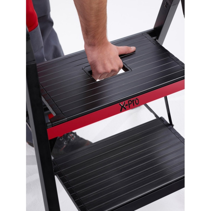 • Unikāls dizains nozīmē, ka jūsu kāpnes būs iespējams izmantot arī kā darba galdu. Izturīga konstrukcija, patentēta viru sistēma un neslīdošas kājas nodrošina maksimālu stabilitāti. Ar rokturi augšējā pakāpienā kāpnes ir viegli lietojamas un pārvietojamas. X-Pro® ir daudzfunkcionāla kāpnes profesionāļiem.