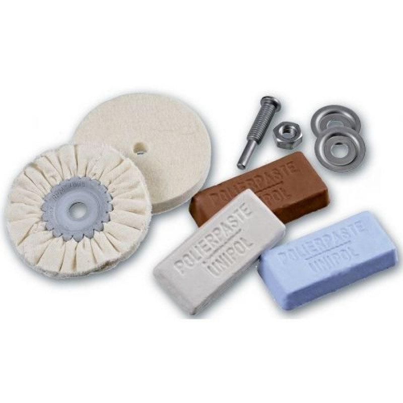 Komplekta sastāvs: 1 filca disks 1 salocīts filca disks Pulēšanas pulveris balts Pulēšanas pulveris brūns Pulēšanas maisījums zils 1 konusa formas kāja Ø 6 mm.