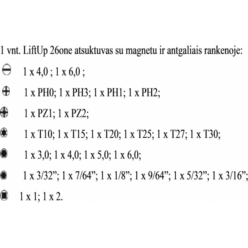 Iepakojums: 1 gab. Skrūvgriežu komplekts "LiftUp 26" ar uzgaļiem rokturī. Uzgaļi: 30 mm.