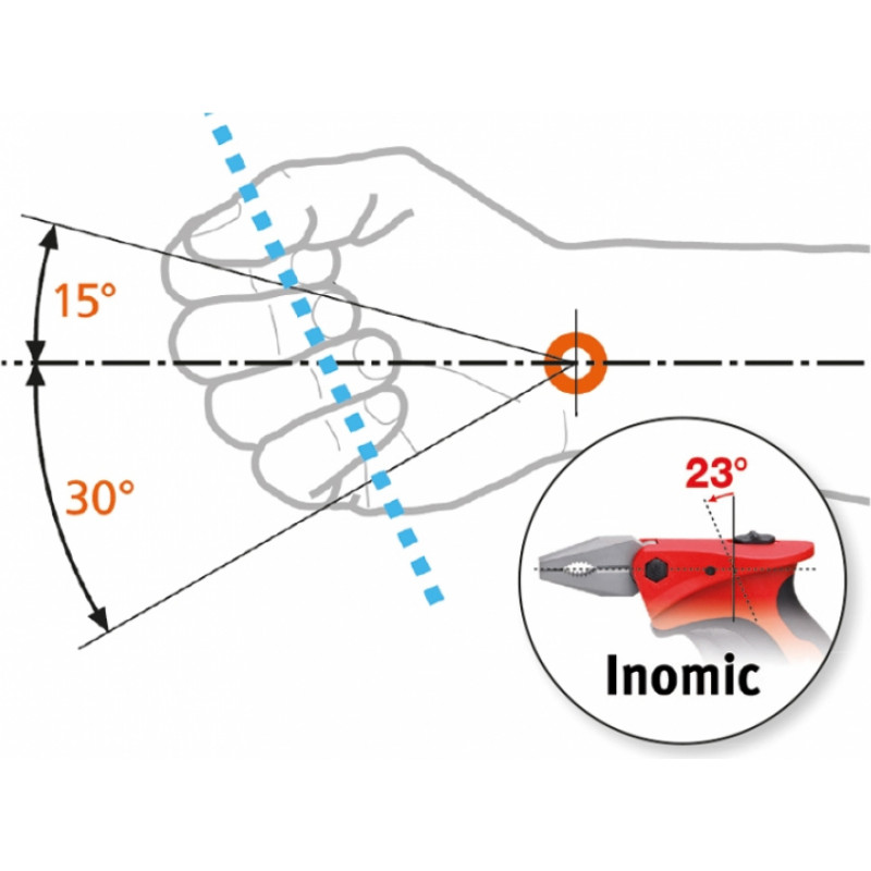 • Pateicoties roktura izvirzītajai formai (23 °) Inomic® un ļoti mazajam svaram, knaibles aizsargā lietotāja locītavas, cīpslas un muskuļus.