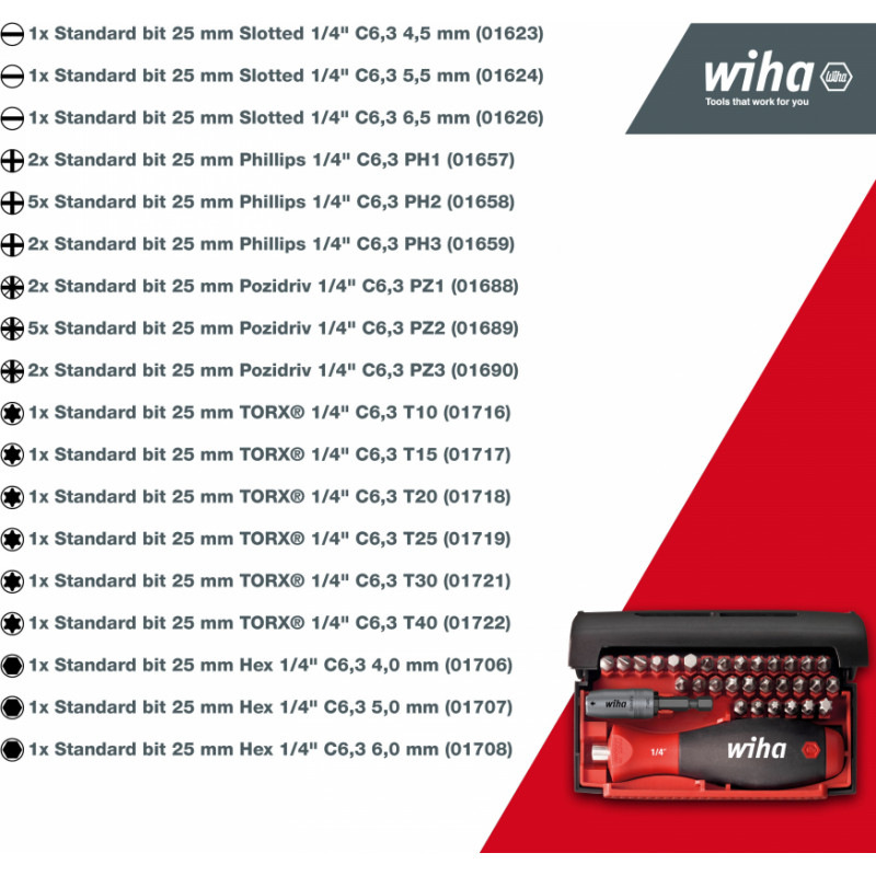 • Rokturis: Wiha SoftFinish® daudzkomponentu rokturis, magnētisks, ar 1/4 "bitu stiprinājumu.