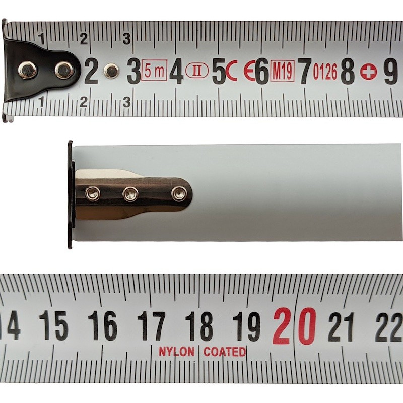 Bārs un āķis: - Trīs kniežu āķis nodrošina izturību. - Neilona pārklājums - lente ilgāk kalpo. Forma un konstrukcija: - 2. klases precizitāte. - CE sertifikāts un pārbaudes sertifikāts nodrošina, ka rulete ir ļoti uzticama un precīza. - Amortizējoša gumijas bremze nodrošina lentes aizsardzību, kad rulete tiek griezta. - Kvalitatīvs vērpes mehānisms nodrošina izturību. - Triecienizturīgs korpuss. - Automātiskā bremzēšanas sistēma. Instrumentu izmanto: - Abrazīvu materiālu mērīšanai.