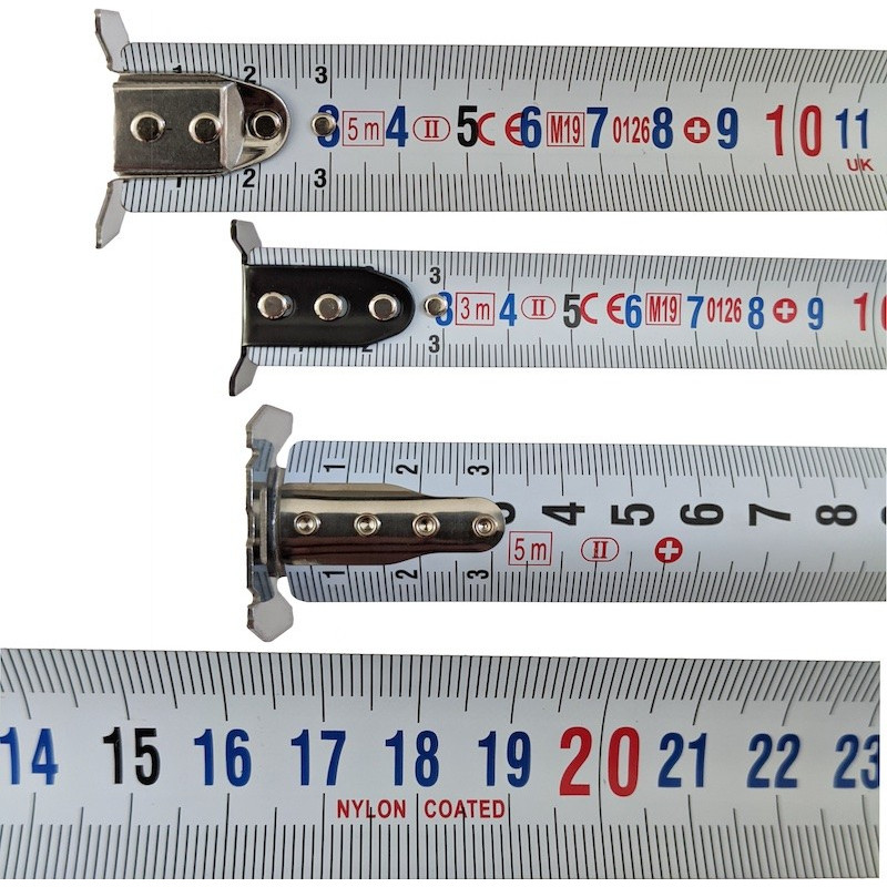 Bārs un āķis: - Neilona pārklājums - lente tiek izmantota ilgāk. - Lentes marķējums abās pusēs - Trīskrāsu marķējums - ātra un vienkārša mērījumu noteikšana Attālums - viegli un ātri izmērāms. - Izturīgs nerūsējošā tērauda āķis. - Magnētisks āķis. - 4 kniežu āķis papildu izturībai. - Kniežu konstrukcija novērš gružu uzkrāšanos starp tām. - Divpusējs āķis. Forma un dizains: - Automātiskā bremzēšanas sistēma. - Triecienizturīgs korpuss ar gumijas pārklājumu. - 2. klases precizitāte. - CE sertifikāts un pārbaudes sertifikāts nodrošina, ka rulete ir īpaši izturīga. uzticama un precīza. - Amortizējoša gumijas bremze nodrošina stieņa aizsardzību, kad rulete tiek griezta. - Augstas kvalitātes vērpes mehānisms nodrošina ilgu kalpošanas laiku.