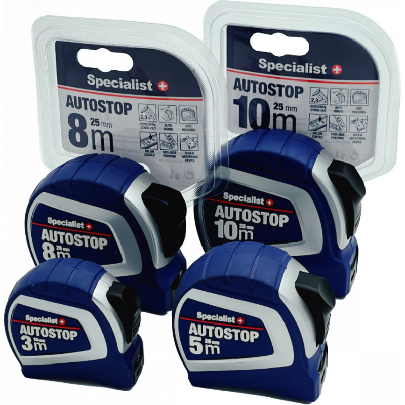 “Specialist+” Autostop Mērīšanas rulete ar automātisku apturēšanas sistēmu. Lente pārklāta ar neilona pārklājumu, kurš ievērojami pagarina mērlentes lietošanas laiku. Marķējums no abām pusēm ērtai mērīšanai jebkurā pozīcijā. Kvalitatīvais iekšējais mehānisms nodrošina netraucētu un drošu mērlentes satīšanu. Triecienizturīgs, ergonomisks korpusa dizains. 2. klases precizitāte, CE sertifikāts un pārbaudes sertifikāts nodrošina, ka rulete ir ļoti uzticama un precīza.