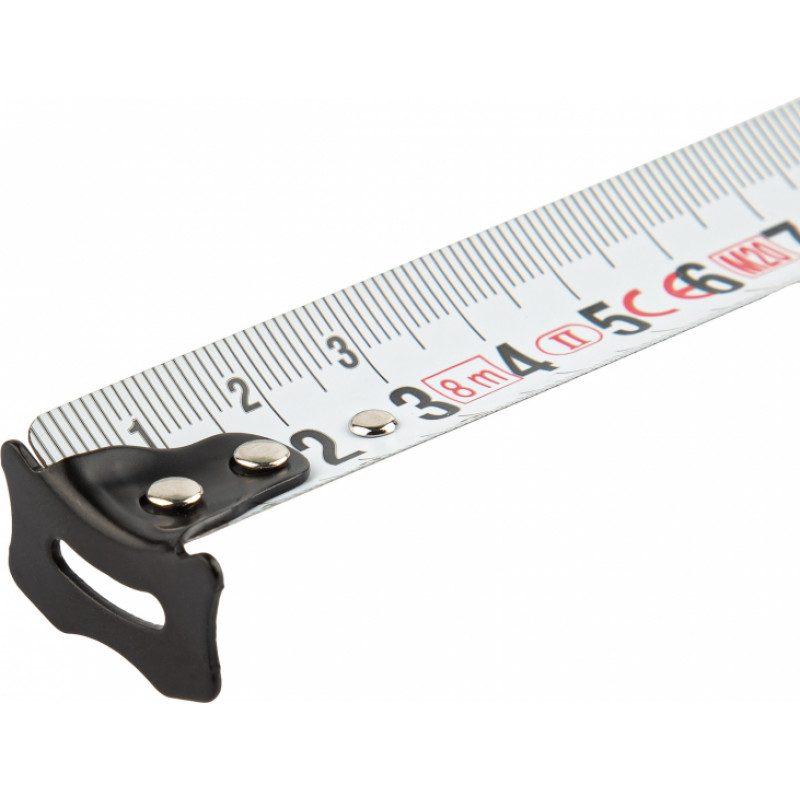 Lente un āķis: • 3 kniežu āķis izturībai. • Neilona pārklājums - ilgākam kalpošanas laikam. • Lentes marķējums abās pusēs. Forma un struktūra: • II klases precizitāte. • CE sertifikāts un pārbaudes sertifikāts nodrošina, ka lente ir ļoti uzticama un precīza. • Triecienizturīga gumijas bremze aizsargā lenti, kad mērlente tiek uzvilkta. • Augstas kvalitātes spoles mehānisms nodrošina izturību. • Triecienizturīgs - ar gumiju pārklāts rāmis. Automātiskā bremzēšanas sistēma. Instrumenta pielietojums: • Abrazīvu materiālu mērīšanai.