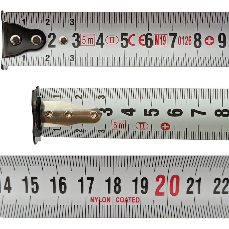 Lente un āķis: • 3 kniežu āķis izturībai. • Neilona pārklājums - ilgākam kalpošanas laikam. • Lentes marķējums abās pusēs. Forma un struktūra: • II klases precizitāte. • CE sertifikāts un pārbaudes sertifikāts nodrošina, ka lente ir ļoti uzticama un precīza. • Triecienizturīga gumijas bremze aizsargā lenti, kad mērlente tiek uzvilkta. • Augstas kvalitātes spoles mehānisms nodrošina izturību. • Triecienizturīgs - ar gumiju pārklāts rāmis. Automātiskā bremzēšanas sistēma. Instrumenta pielietojums: • Abrazīvu materiālu mērīšanai.