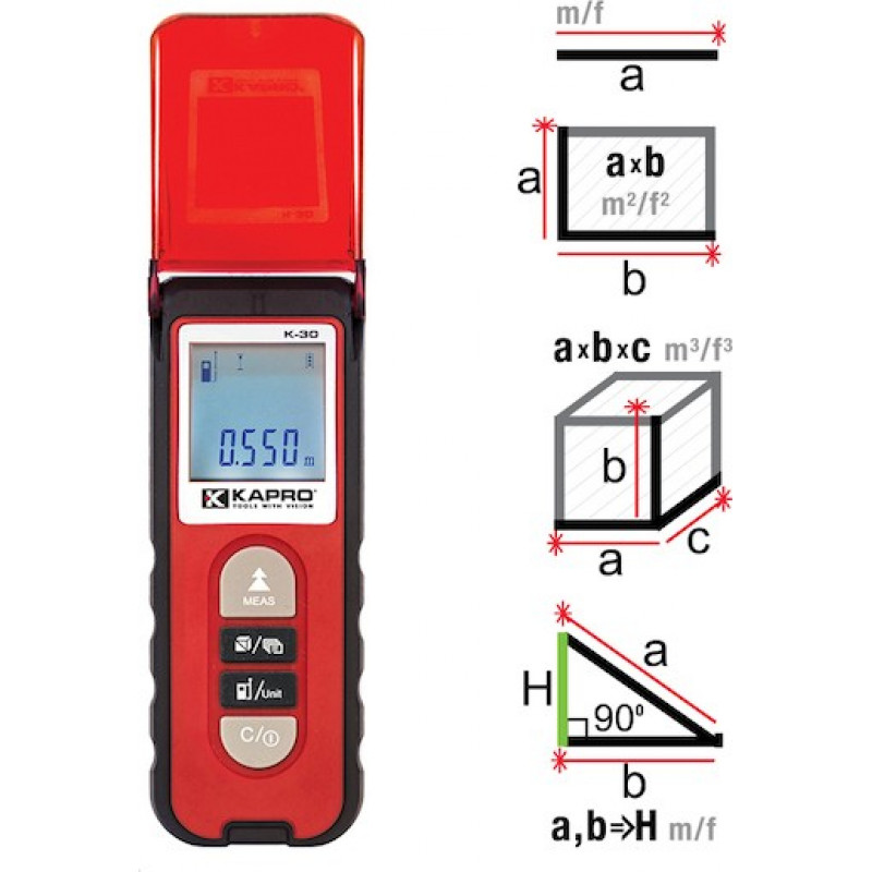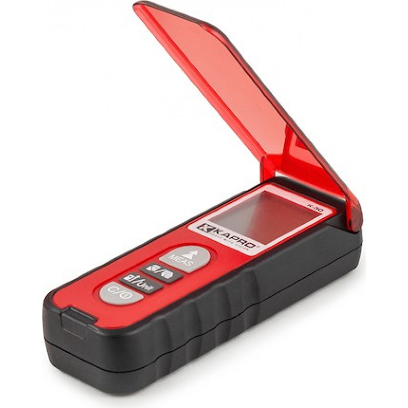 Lāzers: - Mērīšanas attālums līdz 30 m. - Precizitāte 2 mm/m. - Mēra laukumu un tilpumu. - Veic Pitagora teorēmas mērījumus. Forma un konstrukcija: - Salokāms vāks izceļ lāzeru un aizsargā tastatūru. - Izgaismots LCD displejs. - Akumulatora indikators. - Komplektā iekļautas 2xAAA baterijas. - Triecienizturīgs gumijas apvalks. Instrumenta lietojums: - Konstrukcija. - Terases būvniecības darbiem. - Ģipškartona montāžas darbos.