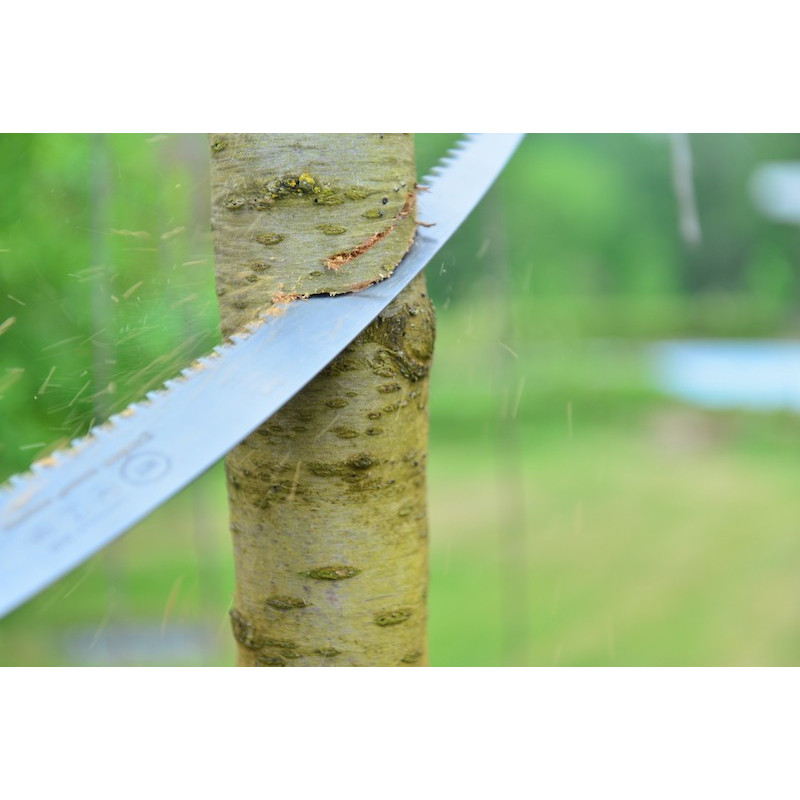 Dārza zāģis ar maksti ar ergonomisku divu sastāvdaļu rokturi, kurš ir droši nofiksēts ar divām skrūvēm. Zāģa zobu trīsšķautņu apstrāde atvieglo darbu ar tiem zariem, kuriem ir grūti piekļūt. Zobu rūdījums palielina instrumenta resursu. Instruments ir optimizēts zaļu un sausu zaru (ar diametru no 30 mm) apgriešanai, kas to padara optimālu darbiem, kas saistīti ar dārza izgriešanu.