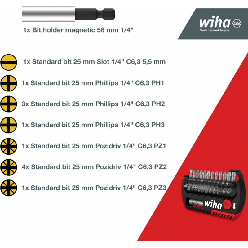Pabīdiet Wiha logotipu uz leju, un padomi būs uzreiz pieejami. Kompakta uzgaļu kaste ar 12 augstas kvalitātes uzgaļiem. Visa veida stiprinājumi tirdzniecībā un rūpniecībā. Viegli iekļaujas bikšu kabatās vai jostas klipā.