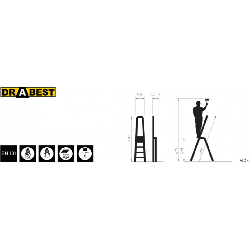 Vienpusējas tērauda kāpnes Drabest HOME, 7 pakāpieni, pelēka krāsa (125 kg)