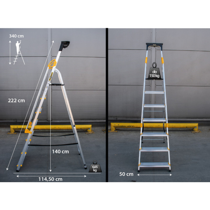 Izturīgas kāpnes ar ērtām ergonomiskām margām, kas palielina to stabilitāti un uzlabo lietošanas ērtumu ikdienas darbā. Lieliski piemērots mājas darbiem, taču to plaši izmantos arī mazie un vidējie uzņēmumi un tīrīšanas un renovācijas uzņēmumi. Ļoti augstas kvalitātes produkts zonām ar zemu vai vidēju darba intensitāti.