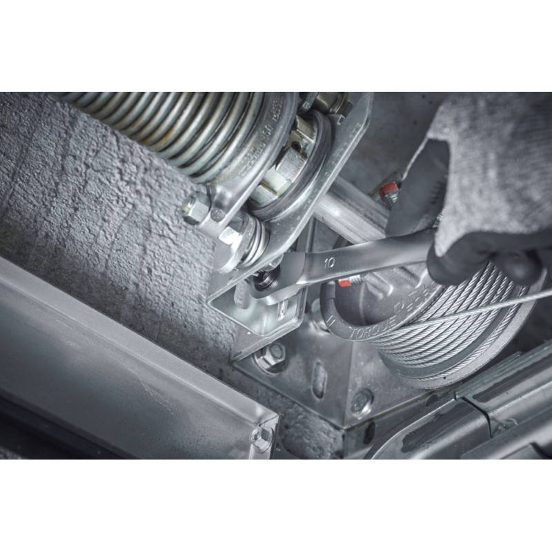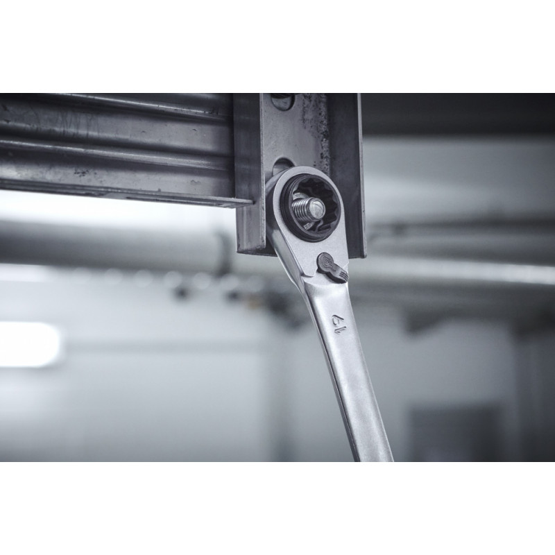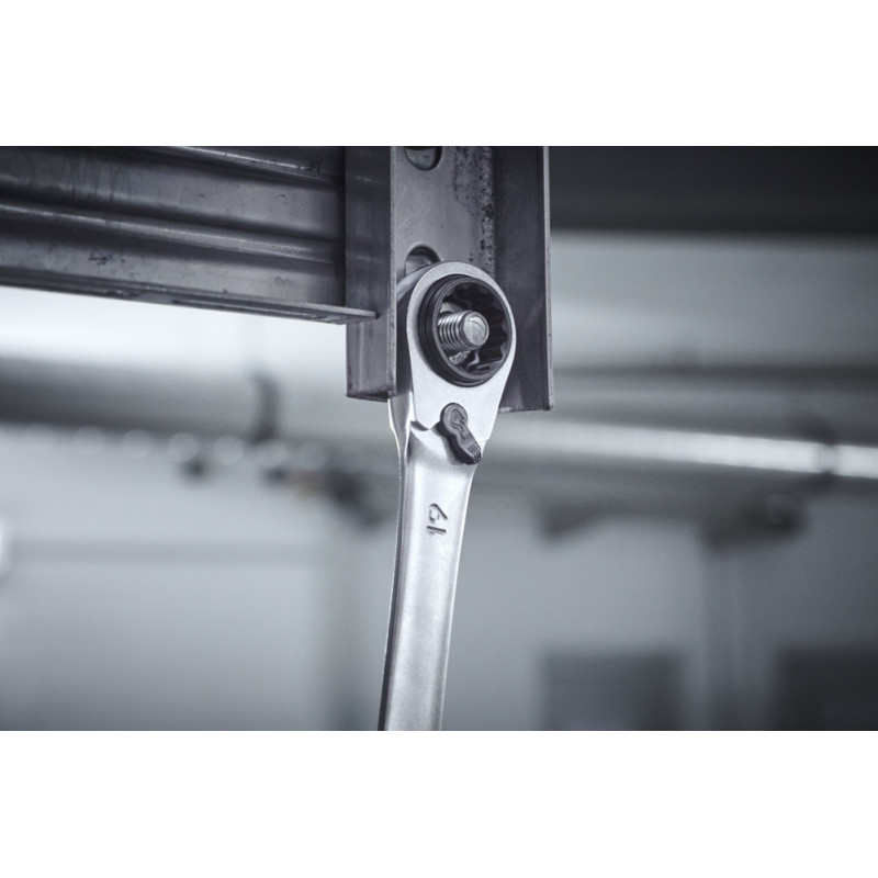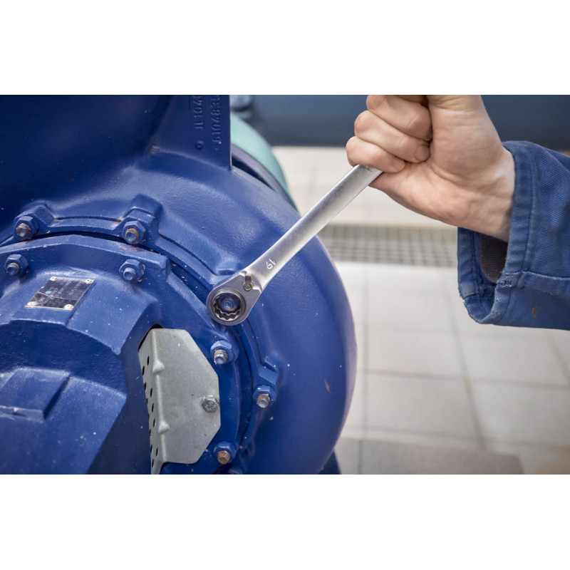 Lai atskrūvētu stingri nostiprinātās skrūves, ir nepieciešams liels spēks. Ar Wiha Ratchet grozāmo uzgriežņu atslēgu lietotājs var viegli atvērt vai pievilkt jebkuru stiprinājumu. Pateicoties četriem dažādiem instrumentu platumiem, 10/13/17/19 mm skrūvju profilus lietotājs var uzlikt tikai ar vienu instrumentu. Tādējādi tiek samazināts amatnieka aprīkojuma svars un instrumentu kastē ir vieta lielākam aprīkojumam. Strādājot ar 4-in-1 sprūdratu, lietotājs gūst labumu no dubultā sešstūra dizaina un smalkiem zobiem ar 72 zobiem, kas nodrošina īsu 5° atgriešanās leņķi un maksimālu komfortu, strādājot šaurās telpās. Integrētā pārnesumu svira ļauj ērti pārslēgties no labās puses uz kreiso. Turklāt dubultā sešstūra ģeometrija ļauj tīri novietot apstrādājamo priekšmetu un tādējādi samazina slīdēšanas risku. Ir iespējams pārslēgties starp dažādiem platumiem, vienkārši pagriežot to ap savu asi. Izgatavota no augstas kvalitātes hroma vanādija tērauda, maiņstrāvas atslēga izceļas ar savu izturību un izturību, papildus tai ir korozijizturīga un viegli tīrāma virsma.
