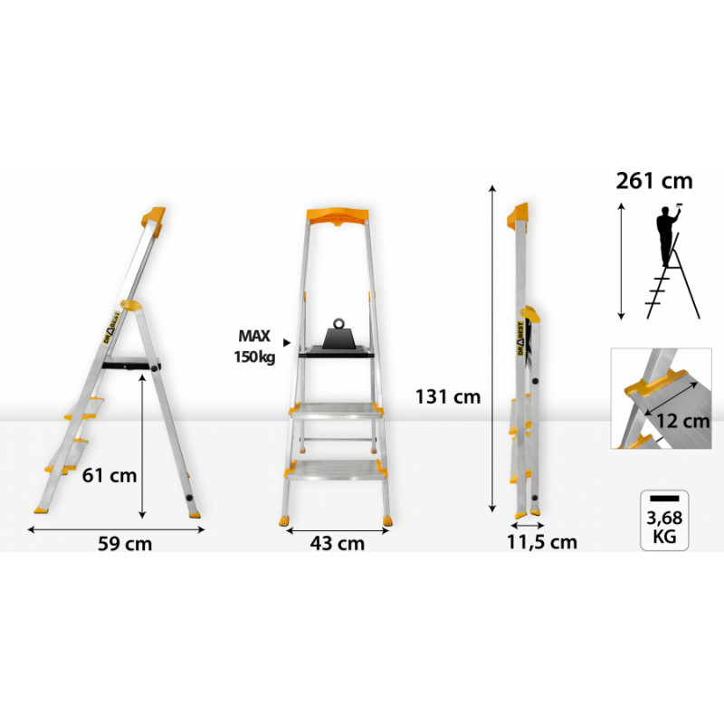 Vienpusējas alumīnija kāpnes Drabest MAX, 3 pakāpieni, 150 kg