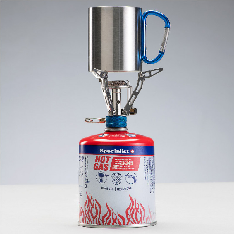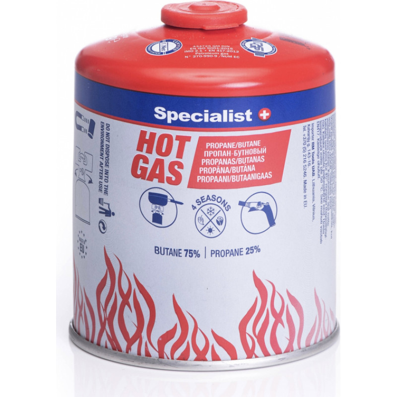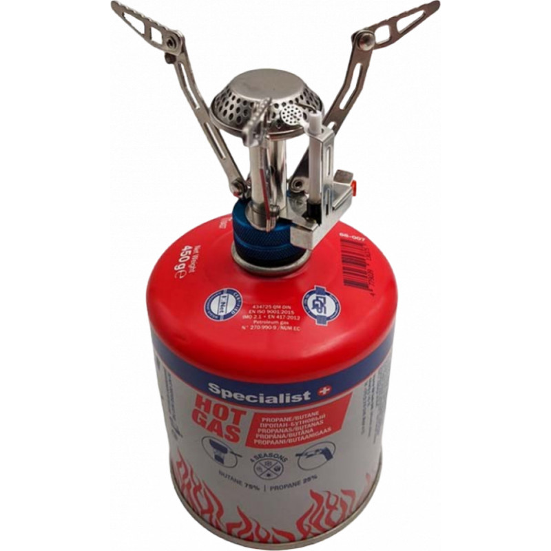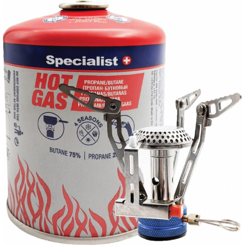Specialist+ tūrisma plīts un gāzes komplekts. Tūrisma plīts apraksts: - Kompakta nerūsējošā tērauda gāzes plīts, kas uzstādīta uz gāzes balona. - Ērta liesmas regulēšana, pjezo aizdedze. - Komplektā iekļauta izturīga plastmasas transporta kaste. Gāzes apraksts: - 25 / 75% propāna un butāna gāzes maisījums, kas nodrošina augstu aktivitāti un siltumu. - Labi darbojas arī aukstumā līdz -20 °C. - Atbilst EN 417 standartam. - Eiropas standartam atbilstoša vītne 7/16.