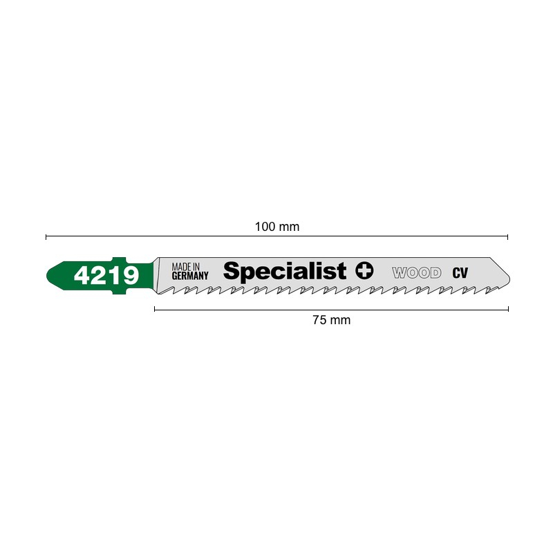 Tīrai koksnes, mēbeļu plāksnes un PVC griešanai. Viens no populārākajiem zāģīšiem koksnei. Garums: 100 mm Zobi: 2,5 mm solis Tērauds: "ChromVanadium", elastīgāks un ilgi saglabājas ass Paredzēts 3-30 mm bieziem materiāliem Taisnam griezumam A=2,5 mm (10 TPI) B=75 mm C=100 mm D=1,45 mm E=8 mm