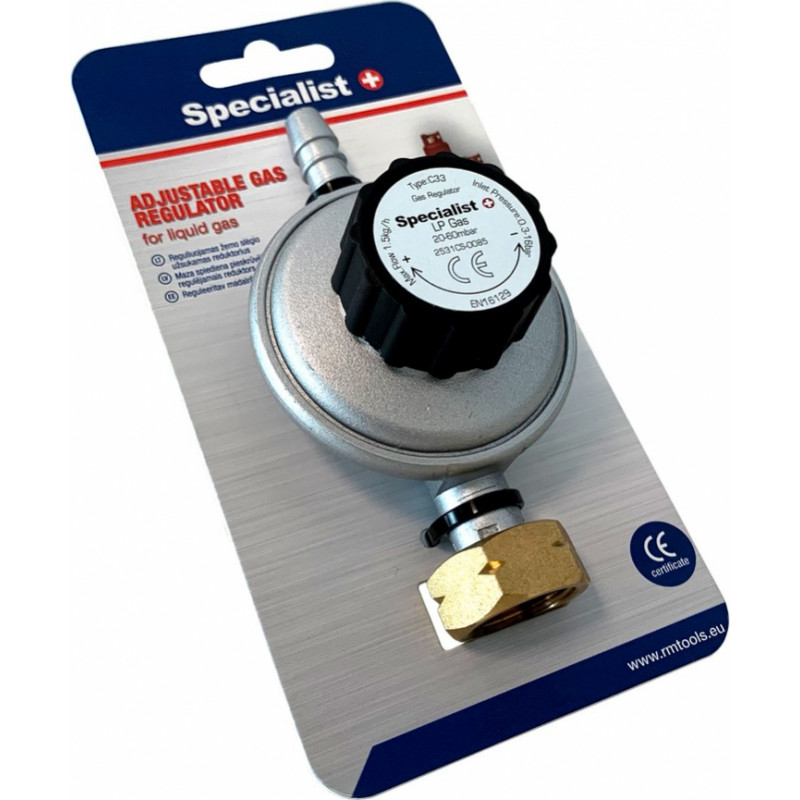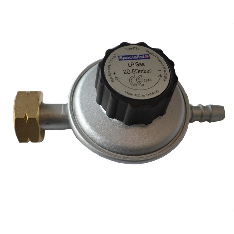 Mājsaimniecības regulējams gāzes reduktors. Gāzes jauda 1,5 kg/h, gāzes spiediens regulējams no 20 līdz 60 mbar.