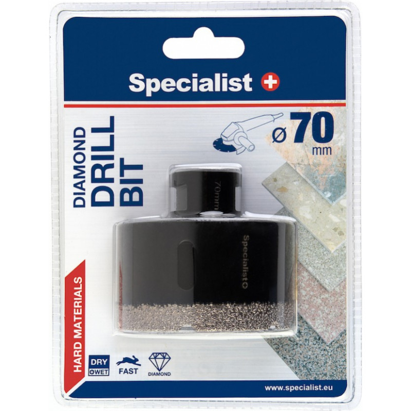 Dimanta kroņurbis ir paredzēts lietošanai ar leņķa slīpmašīnu, pēc jaunas, progresīvas vakuuma metodes izgatavoti dimanta urbji, izceļas ar ilgmūžību un lielu efektivitāti. Šie urbji ir paredzēti īpaši cietu materiālu urbšanai gan sausā, gan slapjā veidā. M14 vītņveida stiprinājums ir paredzēts leņķa slīpmašīnām. Leņķa slīpmašīna nodrošina lielus apgriezienus, kas ir nepieciešami efektīvam urbja darbam. Īpaši efektīvs veids, sausi urbjot cietus materiālus, tādus kā akmens masa, ļoti cietas akmens masas flīzes. Lietojot ūdeni, var pagarināt urbja kalpošanas laiku.