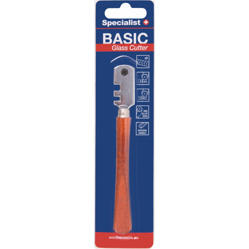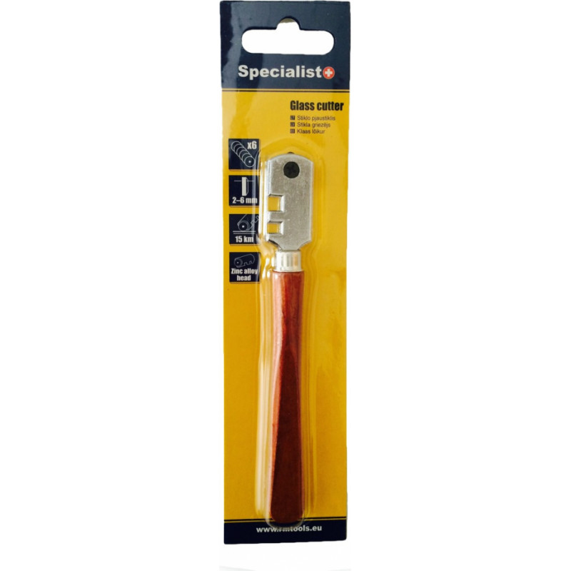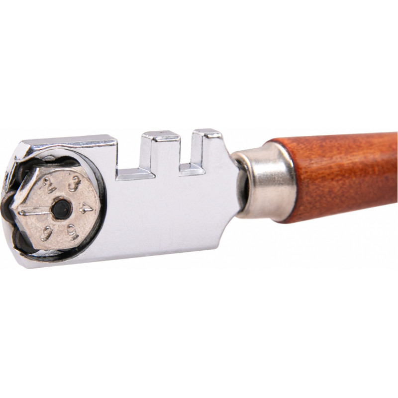 Stikla griezējs ar papildu cietmetāla ritentiņiem un koka rokturi.