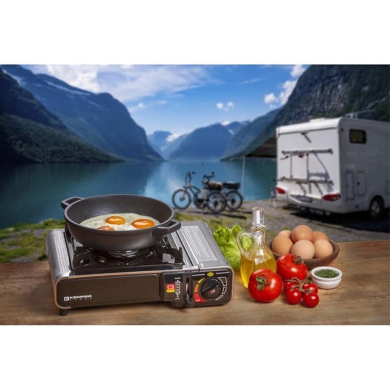 Gāzes plīts izmantošanai ar KEMPER butāna gāzi G577. Ļoti viegli izmantot, ir automātiskā pjezo aizdedze, ir ērta soma, ātri sagatavojama darbam, stabilais pamats ļauj gatavot ēdienu pat visai lielos katlos.