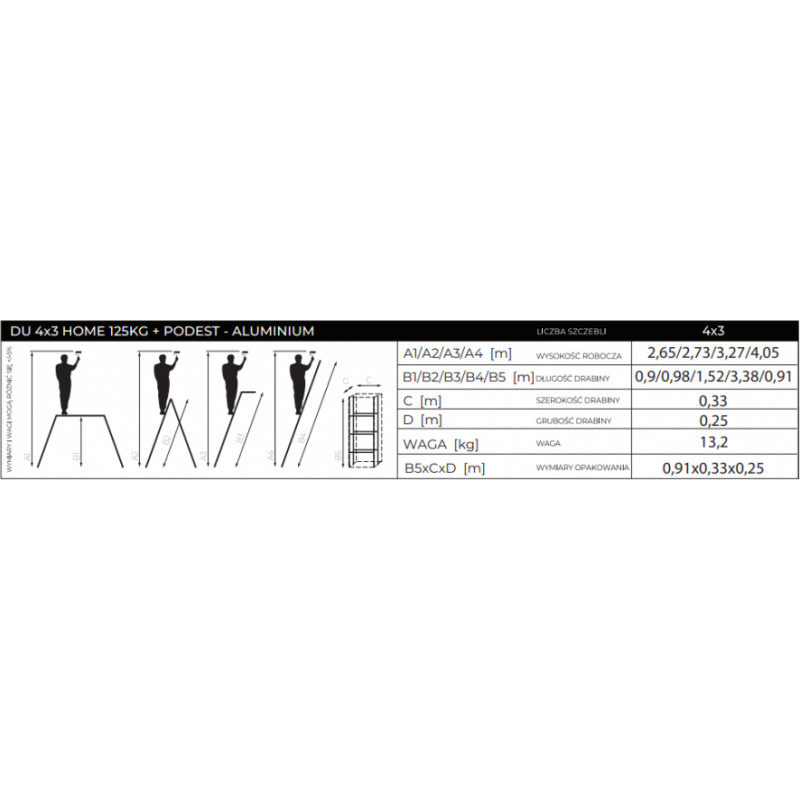 Drabest Universālas alumīnija kāpnes, Drabest HOME 4x3 + PLATFORMA, 125 kg