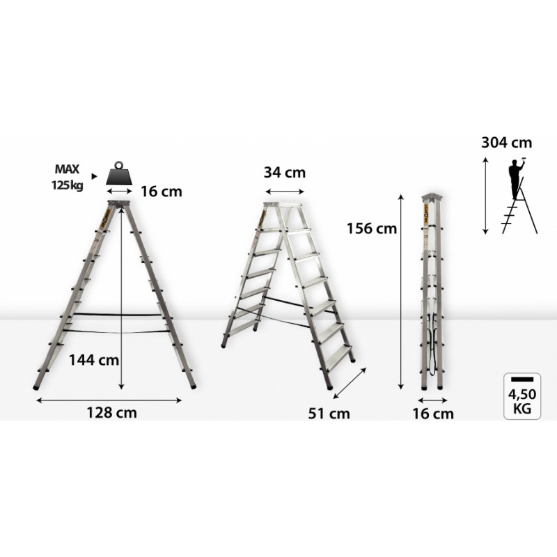 Alumīnija abpusējām kāpnēm ir daudz īpašību, kas padara tās piemērotas ikdienas lietošanai un nelieliem remonta un celtniecības darbiem gan mājsaimniecībā, gan komerciālajā sektorā.