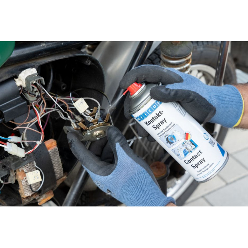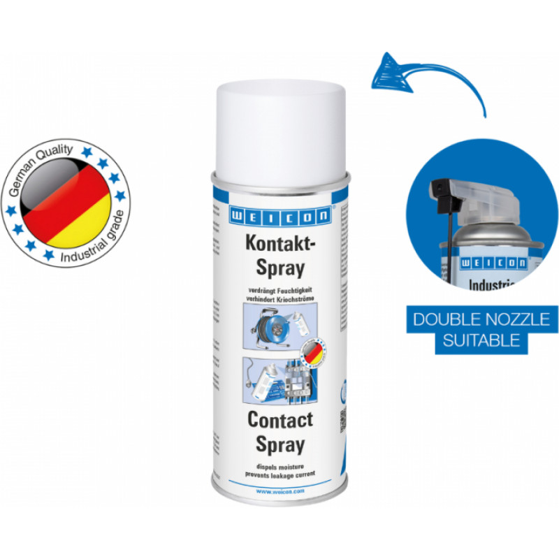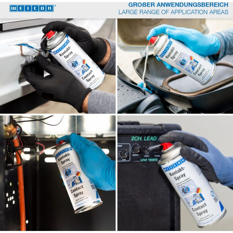WEICON Contact Spray ir izveidots ar īpašu aktīvo sastāvdaļu kombināciju elektrisko kontaktu un komponentu aizsardzībai un kopšanai. Tas izkliedē mitrumu no elektriskajiem kontaktiem, novērš noplūdes strāvu un sprieguma zudumus, kā arī kontaktos, drošinājumos, kabeļu savienojumos utt. bez oksidācijas un sulfīdu slāņiem. Tāpēc WEICON kontakta aerosolu var izmantot piem. drošinātāju kārbām, domofoniem, garāžu durvju motoriem, rozetēm, vadiem un savienotājiem, kabeļu tvertnēm un pagarinātājiem, elektriskajiem dārza instrumentiem un apgaismes sistēmām.