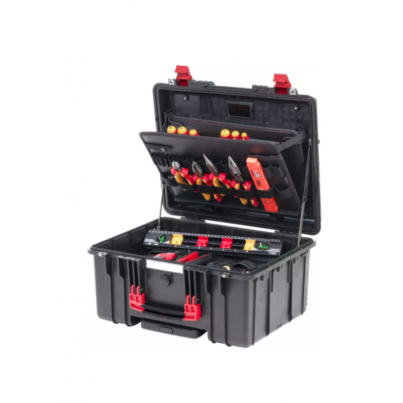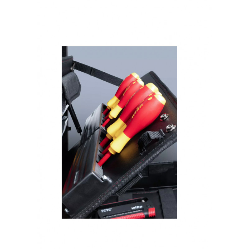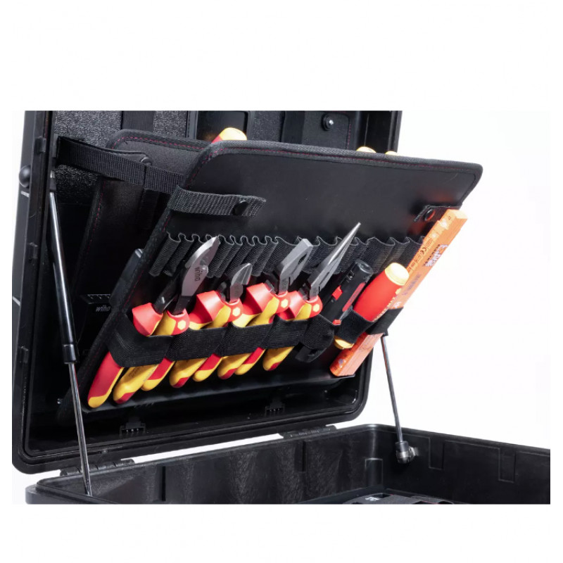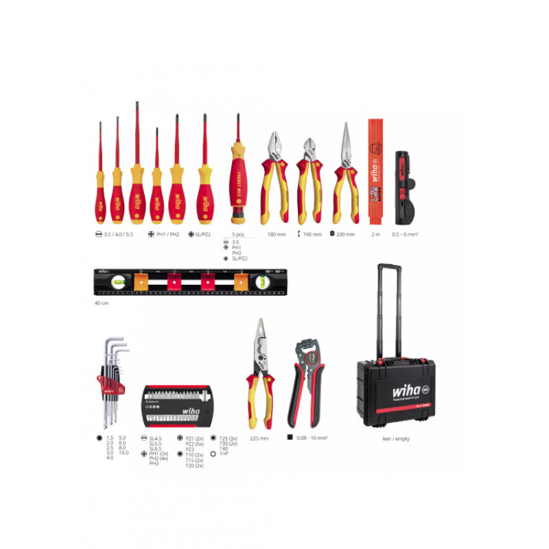 Visu veidu stiprināšanas darbiem ratiņos ir ne tikai L-veida uzgriežņu un uzgaļu komplekts, bet arī seši ergonomiski, izolēti SoftFinish® slimFix skrūvgrieži un kompakti izolēts PocketMax® Electric. Izolētu kombinēto knaibles, adatas knaibles un daudzfunkcionālas knaibles, kā arī diagonālie griezēji ir iekļauti visiem turēšanas, barošanas un griešanas uzdevumiem. Šie izolētie skrūvgrieži un knaibles garantē drošu un drošu darbu pie elektriskajām sistēmām. Instrumentu klāstu papildina noņemams Multitool un gofrēšanas knaibles. Wiha līmeņrādis un elektriķa saliekamais lineāls papildina elektriķu mobilo instrumentu klāstu.