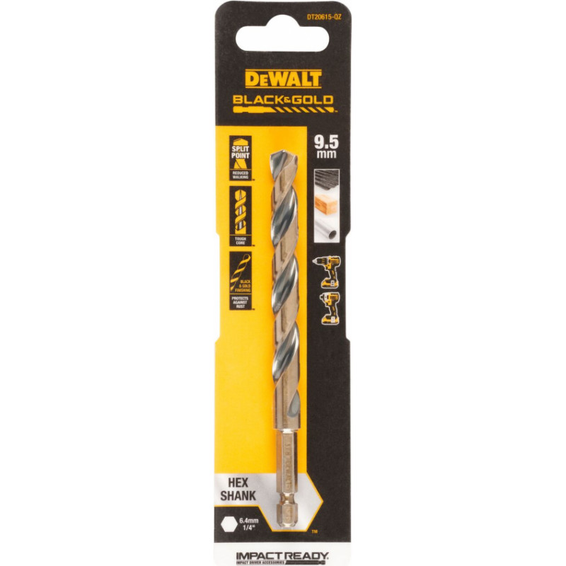 • Melns un zelta pārklājums – aizsardzībai pret rūsu • 135° uzasinājums – novērš slīdēšanu urbšanas sākumā • Piemērots triecienskrūvgriežiem – 1/4" sešstūra kāts, izturīgs pret radiālo griezes momentu, savietojams ar lielāko daļu urbjmašīnu • Izturīga, koniska pinuma konstrukcija – nodrošina īpašu izturību un triecienizturību Piemērots urbšanai: • Tērauds • Dzelzs • Niķelis • Bronza • Koks • Plastmasa