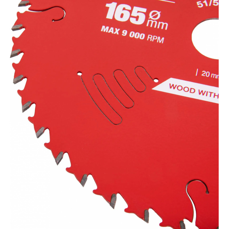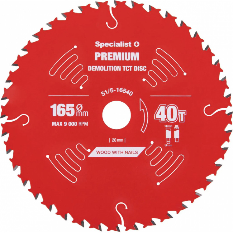 Demolition – augstas kvalitātes TCT griešanas disks, paredzēts konstrukciju kokmateriālu griešanai, tostarp ar naglām. Speciāli pielāgots ātram darbam sarežģītos apstākļos, lieliski piemērots darbam ar akumulatora instrumentiem. Zobi: • ATB 18° tipa zobi – agresīvs leņķis ātrai un efektīvai griešanai. • Mazāks zobu skaits – ātrāka iegriešanās konstrukcijas kokmateriālā. • Rūpnieciskas kvalitātes karbīda zobi – nodilumizturīgi un izturīgi pret triecieniem no naglām. • Pretatgrūdiena zobi – drošākai griešanai Forma un konstrukcija: • Plānāks disks – tīrs, precīzs griezums ar mazāku materiāla pretestību. • Augstas kvalitātes rūdīts tērauds ar Teflona (PTFE) pārklājumu – samazina berzi un novērš materiāla uzkrāšanos. • Pretvibrācijas iegriezumi – mazākas vibrācijas un stabilāks darbs. • Paplašināšanās atveres – efektīva dzesēšana un ilgāks kalpošanas laiks arī intensīvā darbībā. Lietojamais rīks: • Rokas akumulatora ripzāģiem. Griežamie materiāli: • Konstrukciju kokmateriāli ar naglām.