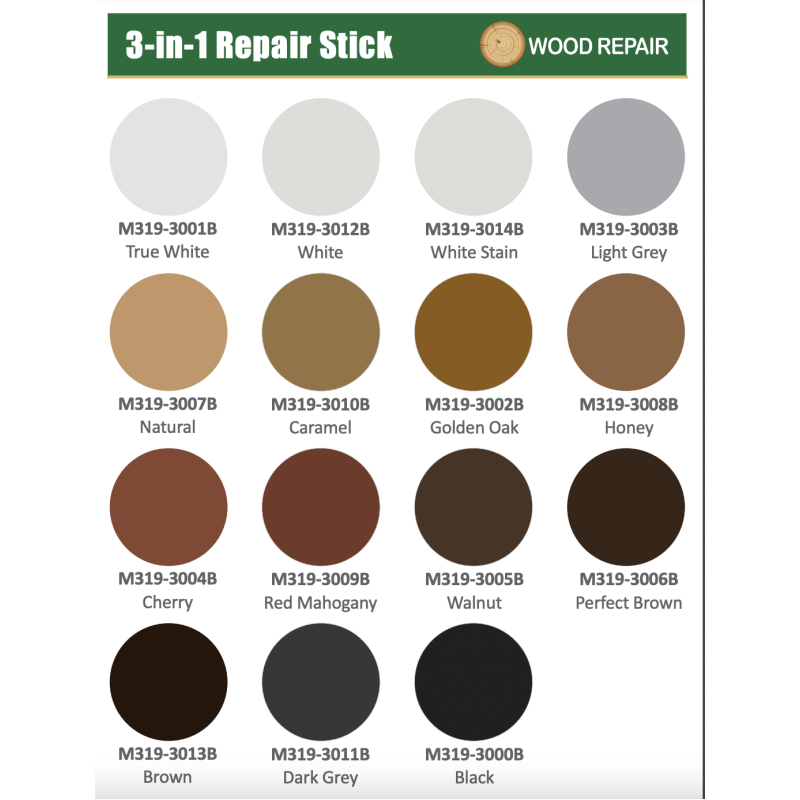 3-in-1 Repair Stick ir pieejams 15 dažādās krāsās, tostarp 3 baltajos toņos, kas īpaši piemērots logu meistariem.